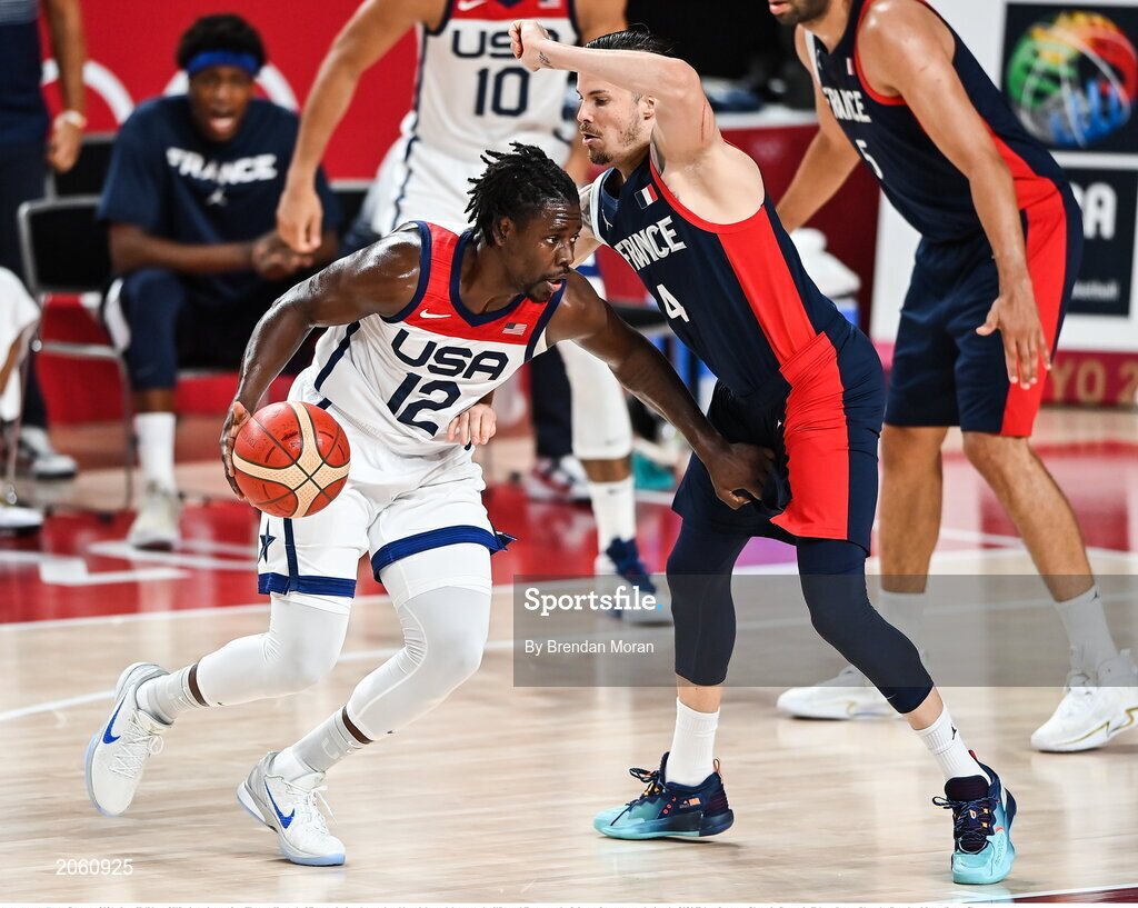 7 August 2021; Jrue Holiday of USA in action against Thomas Heurtel of France during the men's gold medal match between the USA and France at the Saitama Super Arena during the 2020 Tokyo Summer Olympic Games in Tokyo, Japan. Photo by Brendan Moran/Sportsfile