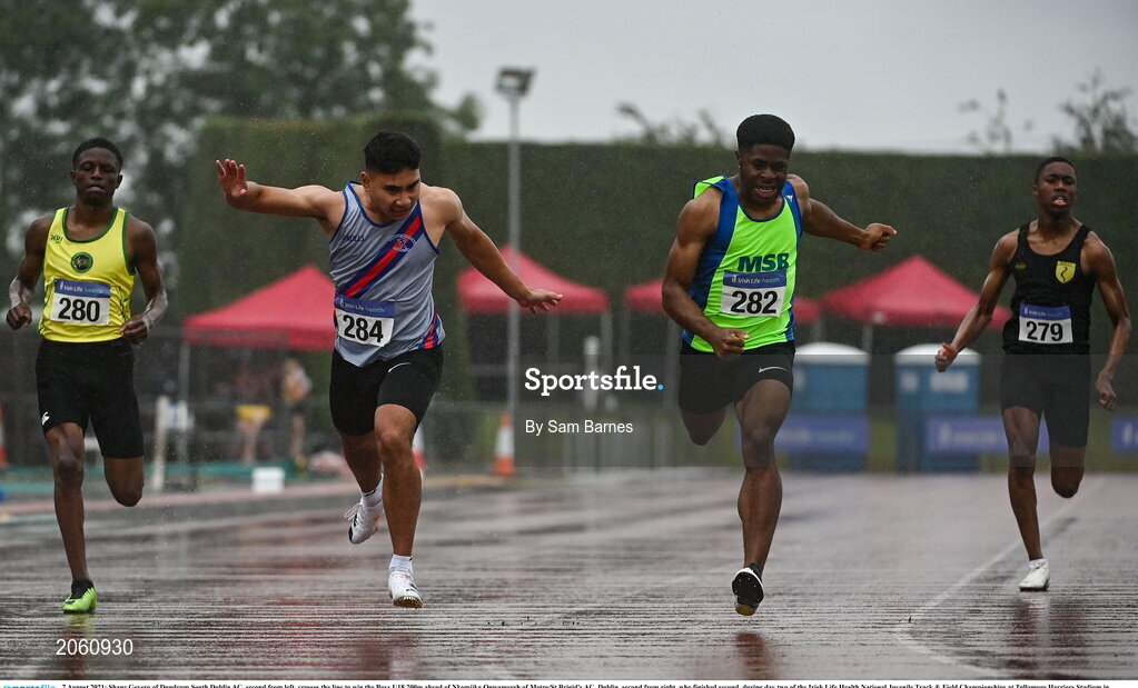 7 August 2021; Shane Gevero of Dundrum South Dublin AC, second from left, crosses the line to win the Boys U18 200m ahead of Nkemjika Onwumereh of Metro/St Brigid's AC, Dublin, second from right, who finished second, during day two of the Irish Life Health National Juvenile Track & Field Championships at Tullamore Harriers Stadium in Tullamore, Offaly. Photo by Sam Barnes/Sportsfile