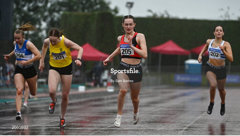 7 August 2021; Kate O'Connell of Lucan Harriers AC, Dublin, second from right, crosses the finish line of the Girl's U18 200m during day two of the Irish Life Health National Juvenile Track & Field Championships at Tullamore Harriers Stadium in Tullamore, Offaly. Photo by Sam Barnes/Sportsfile