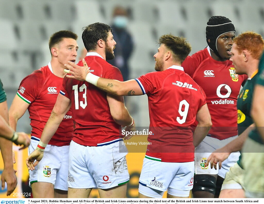 7 August 2021; Robbie Henshaw and Ali Price of British and Irish Lions embrace during the third test of the British and Irish Lions tour match between South Africa and British and Irish Lions at Cape Town Stadium in Cape Town, South Africa. Photo by Ashley Vlotman/Sportsfile