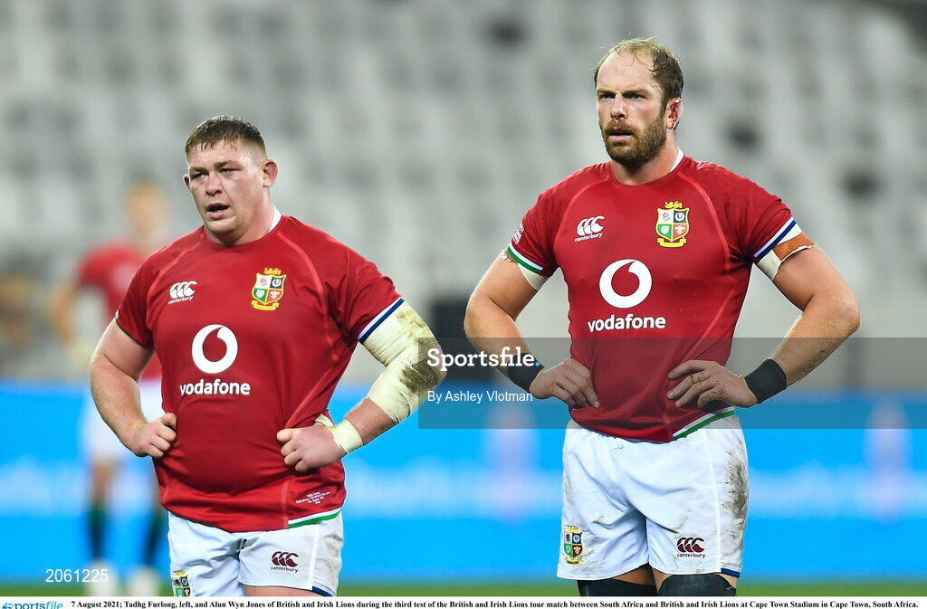 7 August 2021; Tadhg Furlong, left, and Alun Wyn Jones of British and Irish Lions during the third test of the British and Irish Lions tour match between South Africa and British and Irish Lions at Cape Town Stadium in Cape Town, South Africa. Photo by Ashley Vlotman/Sportsfile