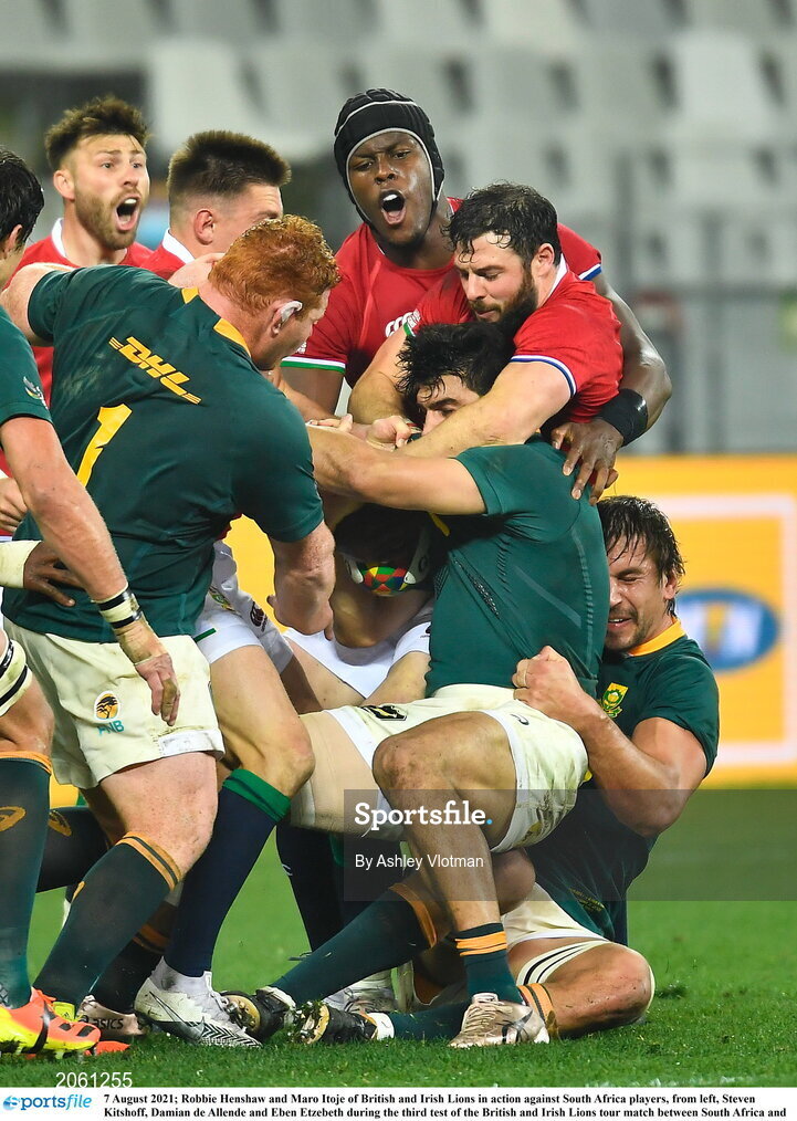 7 August 2021; Robbie Henshaw and Maro Itoje of British and Irish Lions in action against South Africa players, from left, Steven Kitshoff, Damian de Allende and Eben Etzebeth during the third test of the British and Irish Lions tour match between South Africa and British and Irish Lions at Cape Town Stadium in Cape Town, South Africa. Photo by Ashley Vlotman/Sportsfile