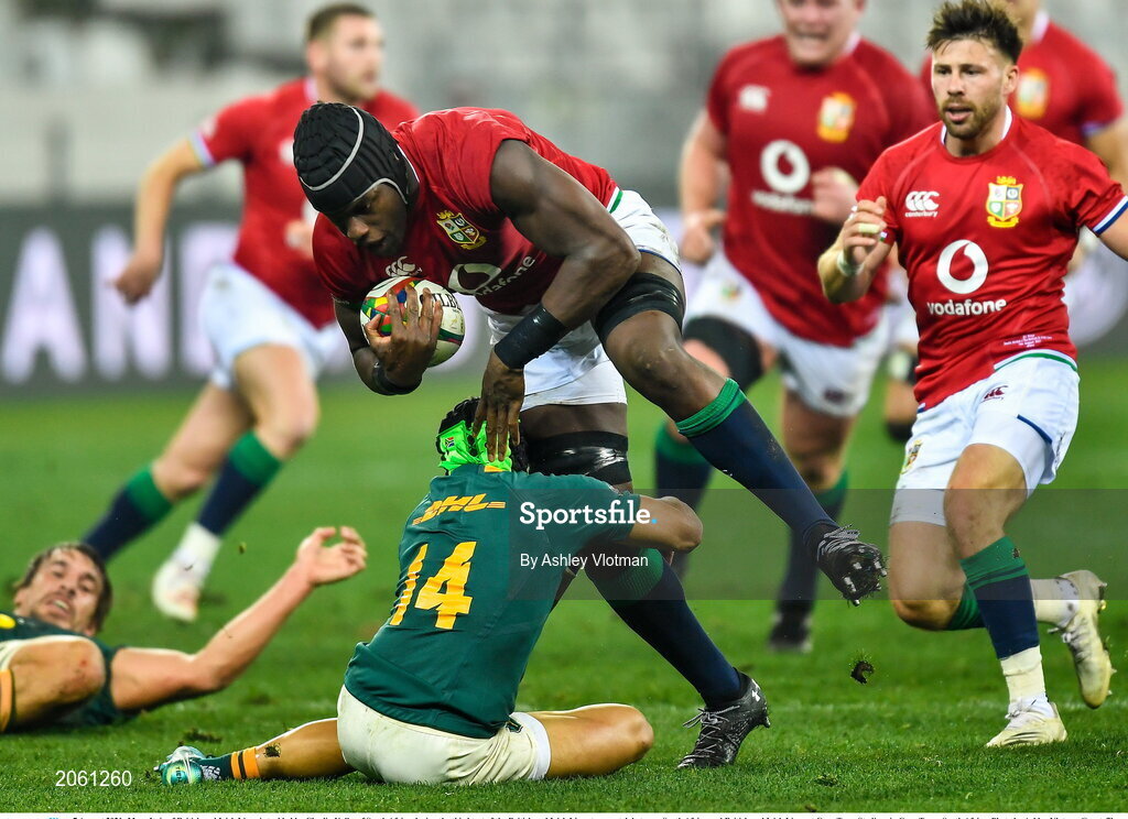 7 August 2021; Maro Itoje of British and Irish Lions is tackled by Cheslin Kolbe of South Africa during the third test of the British and Irish Lions tour match between South Africa and British and Irish Lions at Cape Town Stadium in Cape Town, South Africa. Photo by Ashley Vlotman/Sportsfile