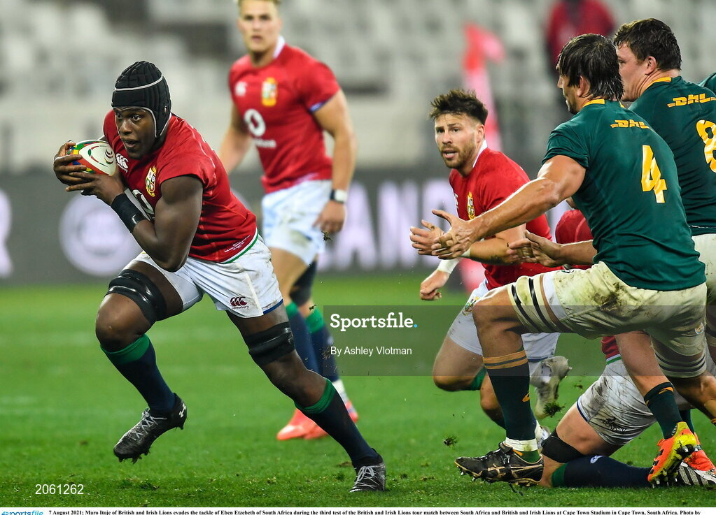 7 August 2021; Maro Itoje of British and Irish Lions evades the tackle of Eben Etzebeth of South Africa during the third test of the British and Irish Lions tour match between South Africa and British and Irish Lions at Cape Town Stadium in Cape Town, South Africa. Photo by Ashley Vlotman/Sportsfile