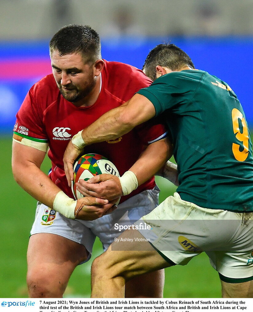 7 August 2021; Wyn Jones of British and Irish Lions is tackled by Cobus Reinach of South Africa during the third test of the British and Irish Lions tour match between South Africa and British and Irish Lions at Cape Town Stadium in Cape Town, South Africa. Photo by Ashley Vlotman/Sportsfile