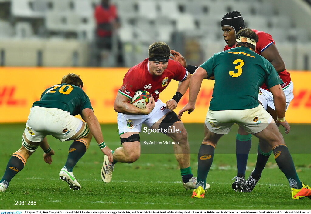 7 August 2021; Tom Curry of British and Irish Lions in action against Kwagga Smith, left, and Frans Malherbe of South Africa during the third test of the British and Irish Lions tour match between South Africa and British and Irish Lions at Cape Town Stadium in Cape Town, South Africa. Photo by Ashley Vlotman/Sportsfile