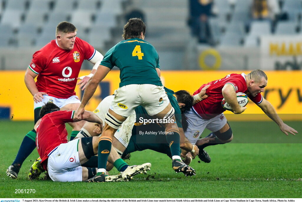 7 August 2021; Ken Owens of the British & Irish Lions makes a break during the third test of the British and Irish Lions tour match between South Africa and British and Irish Lions at Cape Town Stadium in Cape Town, South Africa. Photo by Ashley Vlotman/Sportsfile