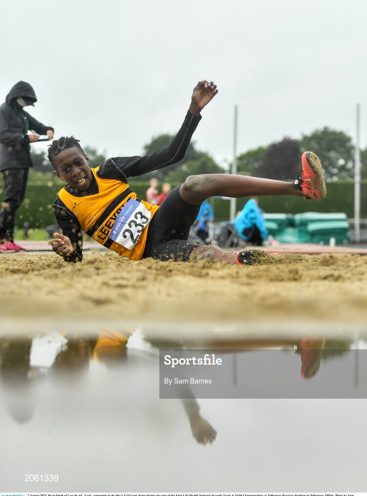 7 August 2021; Ryan Onoh of Leevale AC, Cork, competing in the Boy's U14 Long Jump during day two of the Irish Life Health National Juvenile Track & Field Championships at Tullamore Harriers Stadium in Tullamore, Offaly. Photo by Sam Barnes/Sportsfile