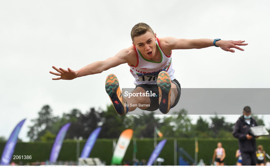 7 August 2021; Aaron O'Connor of Limerick AC competing in the Boy's U17 Triple Jump during day two of the Irish Life Health National Juvenile Track & Field Championships at Tullamore Harriers Stadium in Tullamore, Offaly. Photo by Sam Barnes/Sportsfile
