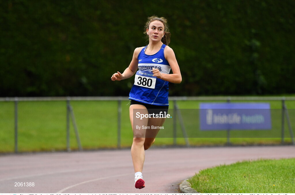 7 August 2021; Cara Laverty of Finn Valley AC, Donegal, on her way to winning the Girl's U19 800m during day two of the Irish Life Health National Juvenile Track & Field Championships at Tullamore Harriers Stadium in Tullamore, Offaly. Photo by Sam Barnes/Sportsfile