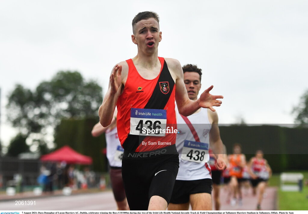 7 August 2021; Dara Donoghue of Lucan Harriers AC, Dublin, celebrates winning the Boys U18 800m during day two of the Irish Life Health National Juvenile Track & Field Championships at Tullamore Harriers Stadium in Tullamore, Offaly. Photo by Sam Barnes/Sportsfile