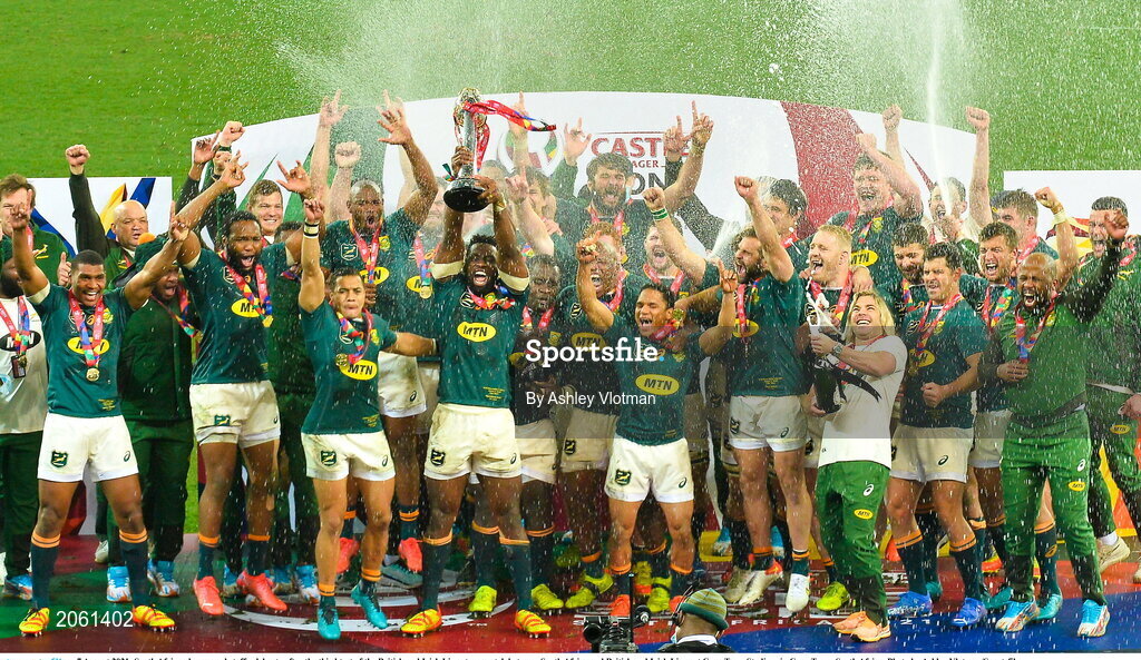 7 August 2021; South Africa players and staff celebrate after the third test of the British and Irish Lions tour match between South Africa and British and Irish Lions at Cape Town Stadium in Cape Town, South Africa. Photo by Ashley Vlotman/Sportsfile