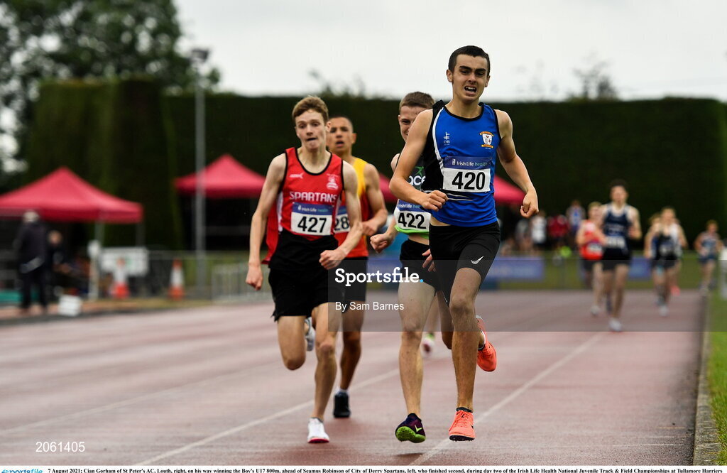 7 August 2021; Cian Gorham of St Peter's AC, Louth, right, on his way winning the Boy's U17 800m, ahead of Seamus Robinson of City of Derry Spartans, left, who finished second, during day two of the Irish Life Health National Juvenile Track & Field Championships at Tullamore Harriers Stadium in Tullamore, Offaly. Photo by Sam Barnes/Sportsfile