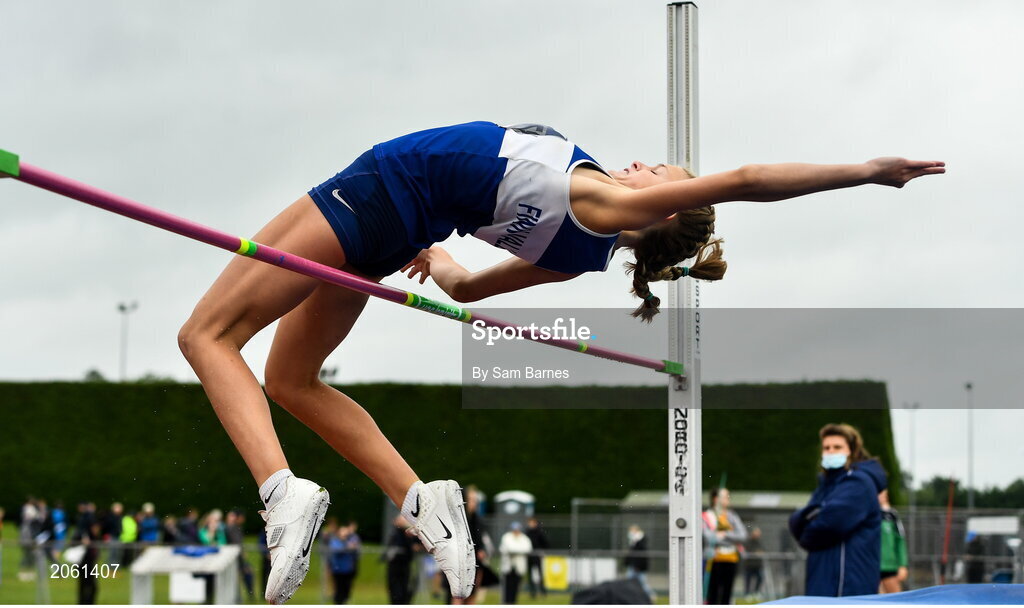 7 August 2021; Amy Timoney of Finn Valley AC, Donegal, competing in the Girl's U15 High Jump during day two of the Irish Life Health National Juvenile Track & Field Championships at Tullamore Harriers Stadium in Tullamore, Offaly. Photo by Sam Barnes/Sportsfile