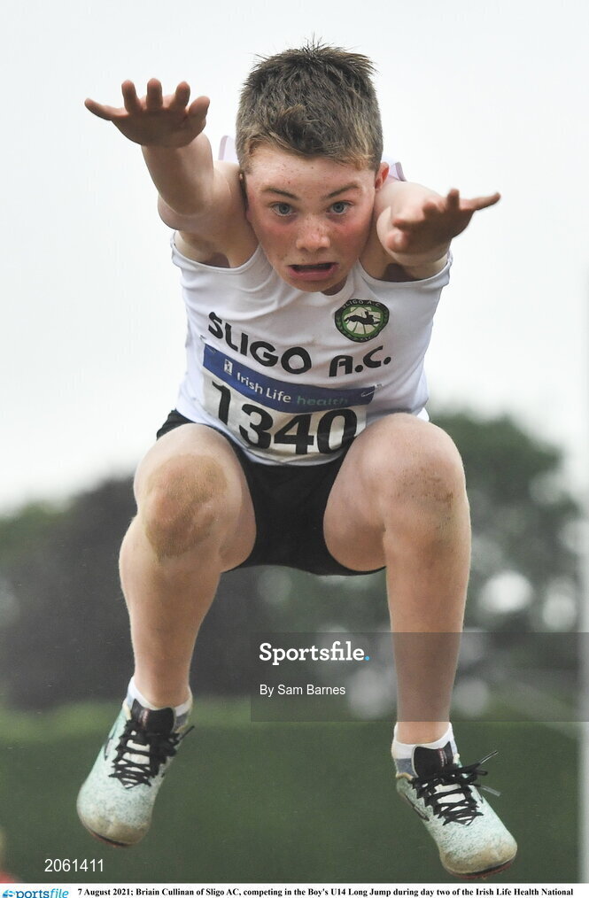 7 August 2021; Briain Cullinan of Sligo AC, competing in the Boy's U14 Long Jump during day two of the Irish Life Health National Juvenile Track & Field Championships at Tullamore Harriers Stadium in Tullamore, Offaly. Photo by Sam Barnes/Sportsfile