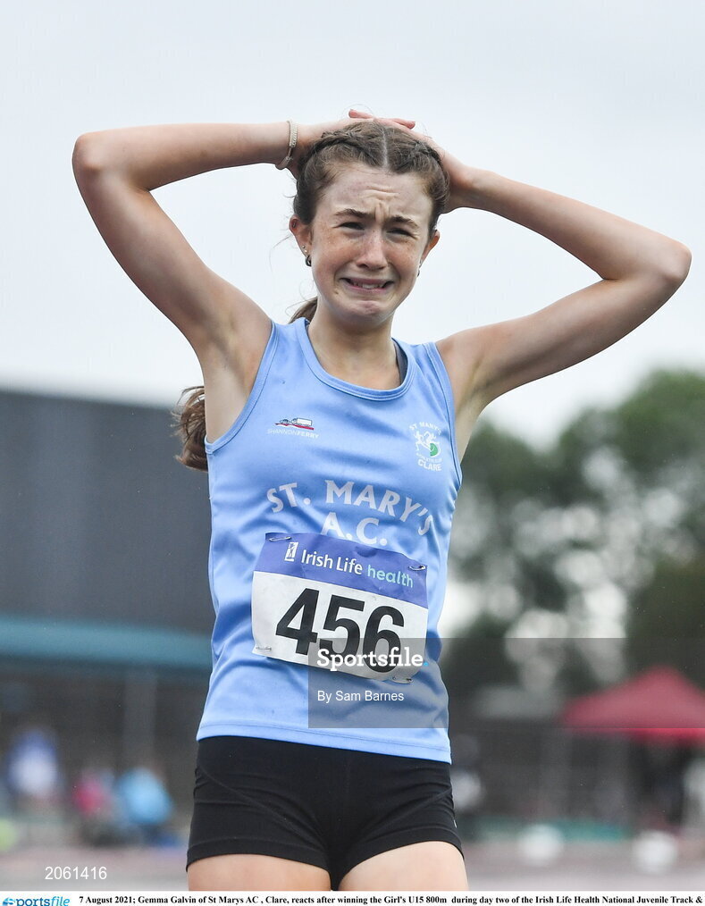 7 August 2021; Gemma Galvin of St Marys AC , Clare, reacts after winning the Girl's U15 800m during day two of the Irish Life Health National Juvenile Track & Field Championships at Tullamore Harriers Stadium in Tullamore, Offaly. Photo by Sam Barnes/Sportsfile
