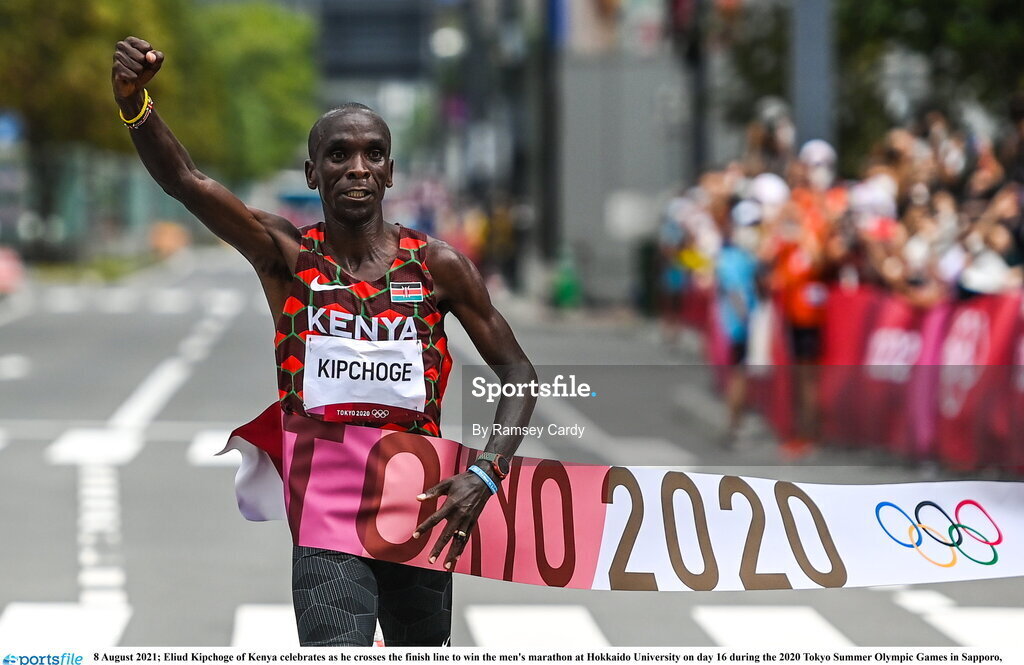 8 August 2021; Eliud Kipchoge of Kenya celebrates as he crosses the finish line to win the men's marathon at Sapporo Odori Park on day 16 during the 2020 Tokyo Summer Olympic Games in Sapporo, Japan. Photo by Ramsey Cardy/Sportsfile