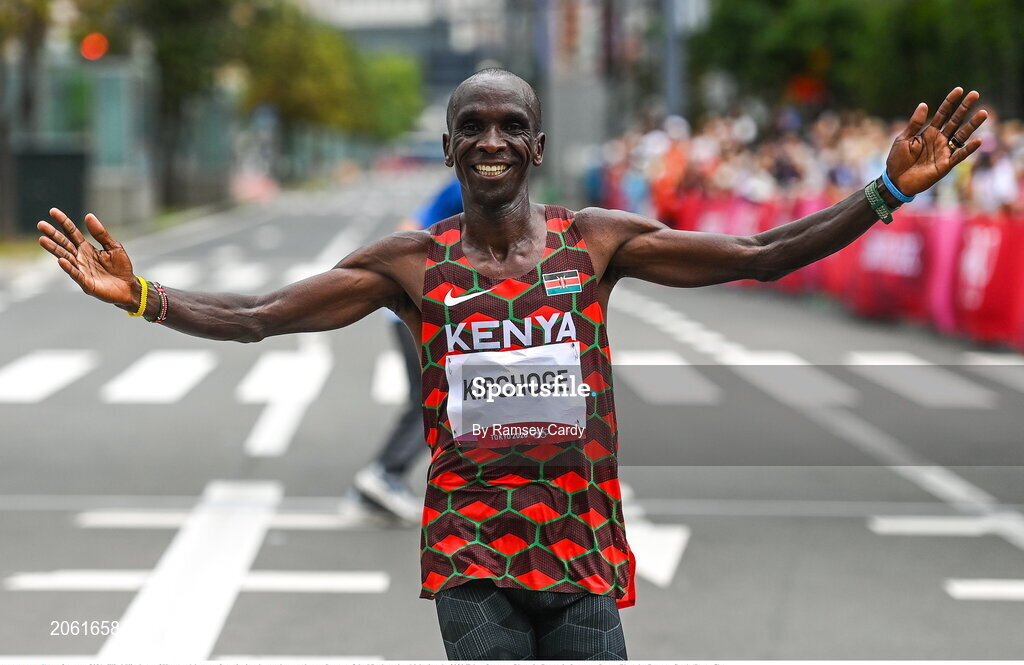 8 August 2021; Eliud Kipchoge of Kenya celebrates after winning the men's marathon at Sapporo Odori Park on day 16 during the 2020 Tokyo Summer Olympic Games in Sapporo, Japan. Photo by Ramsey Cardy/Sportsfile