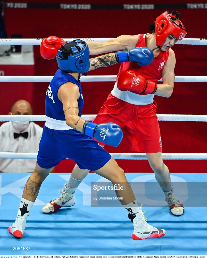 8 August 2021; Kellie Harrington of Ireland, right, and Beatriz Ferreira of Brazil during their women's lightweight final bout at the Kokugikan Arena during the 2020 Tokyo Summer Olympic Games in Tokyo, Japan. Photo by Brendan Moran/Sportsfile