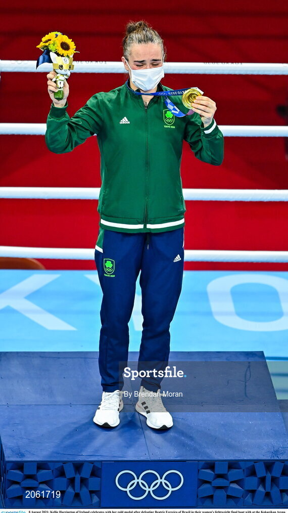 8 August 2021; Kellie Harrington of Ireland celebrates with her gold medal after defeating Beatriz Ferreira of Brazil in their women's lightweight final bout with at the Kokugikan Arena during the 2020 Tokyo Summer Olympic Games in Tokyo, Japan. Photo by Brendan Moran/Sportsfile