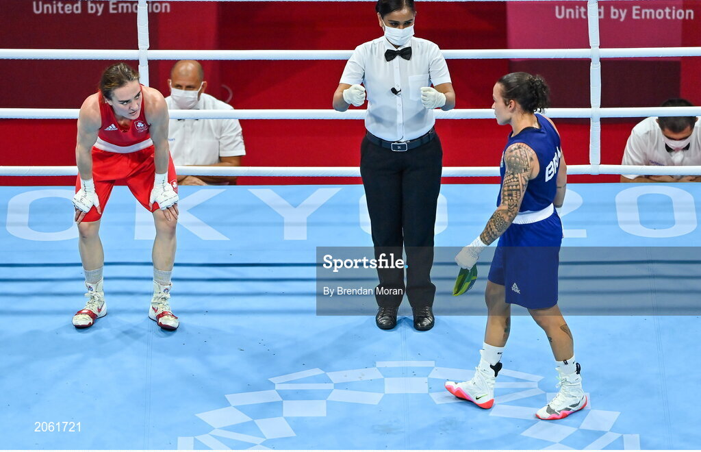8 August 2021; Kellie Harrington of Ireland, left, reacts after being announced as the winner in her lightweight final bout with Beatriz Ferreira of Brazil at the Kokugikan Arena during the 2020 Tokyo Summer Olympic Games in Tokyo, Japan. Photo by Brendan Moran/Sportsfile