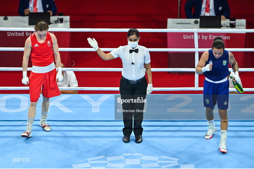 8 August 2021; Kellie Harrington of Ireland, left, reacts after being announced as the winner in her lightweight final bout with Beatriz Ferreira of Brazil at the Kokugikan Arena during the 2020 Tokyo Summer Olympic Games in Tokyo, Japan. Photo by Brendan Moran/Sportsfile
