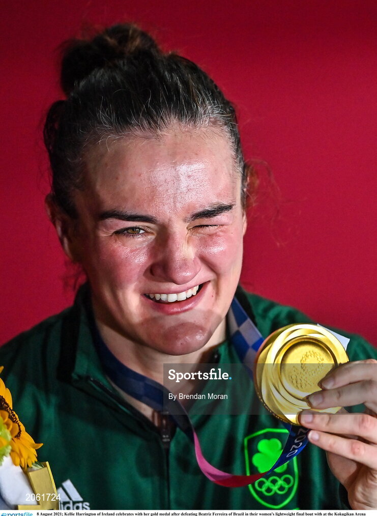 8 August 2021; Kellie Harrington of Ireland celebrates with her gold medal after defeating Beatriz Ferreira of Brazil in their women's lightweight final bout with at the Kokugikan Arena during the 2020 Tokyo Summer Olympic Games in Tokyo, Japan. Photo by Brendan Moran/Sportsfile
