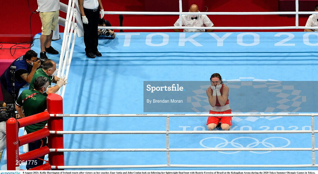 8 August 2021; Kellie Harrington of Ireland reacts after victory as her coaches Zaur Antia and John Conlan look on following her lightweight final bout with Beatriz Ferreira of Brazil at the Kokugikan Arena during the 2020 Tokyo Summer Olympic Games in Tokyo, Japan. Photo by Brendan Moran/Sportsfile
