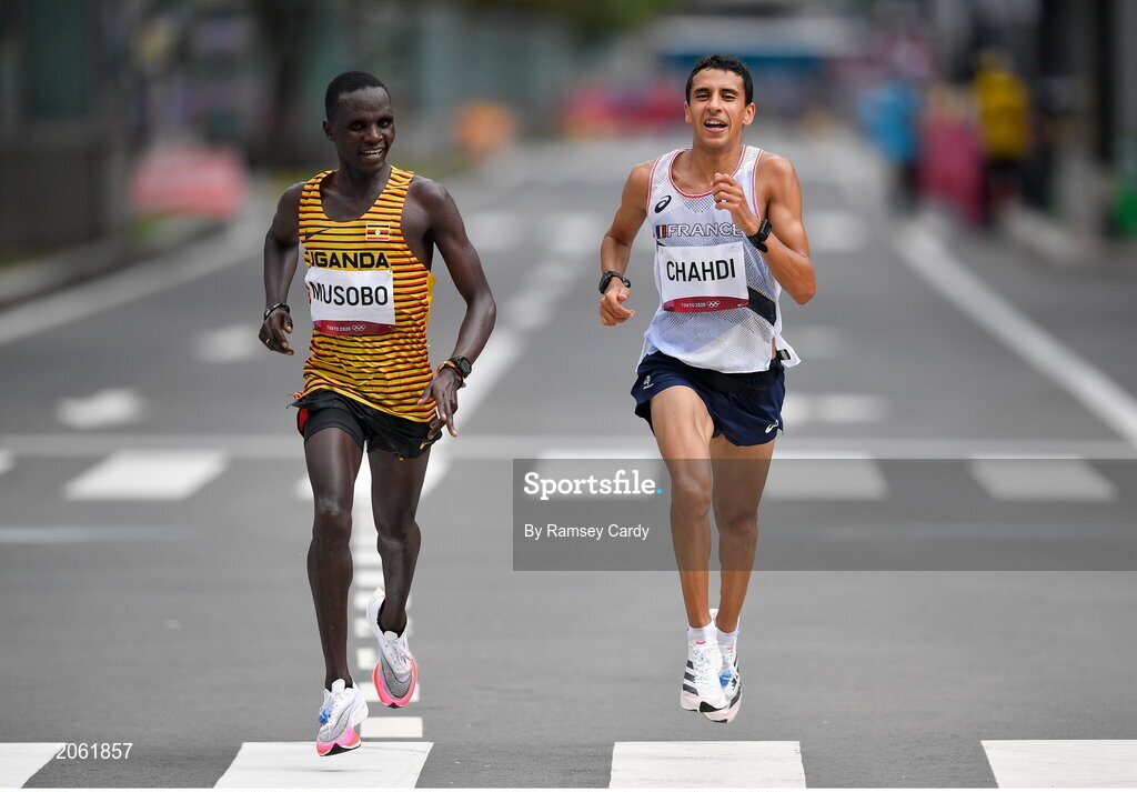 8 August 2021; Fred Musobo of Uganda, left, and Hassan Chahdi of France during the men's marathon at Sapporo Odori Park on day 16 during the 2020 Tokyo Summer Olympic Games in Sapporo, Japan. Photo by Ramsey Cardy/Sportsfile