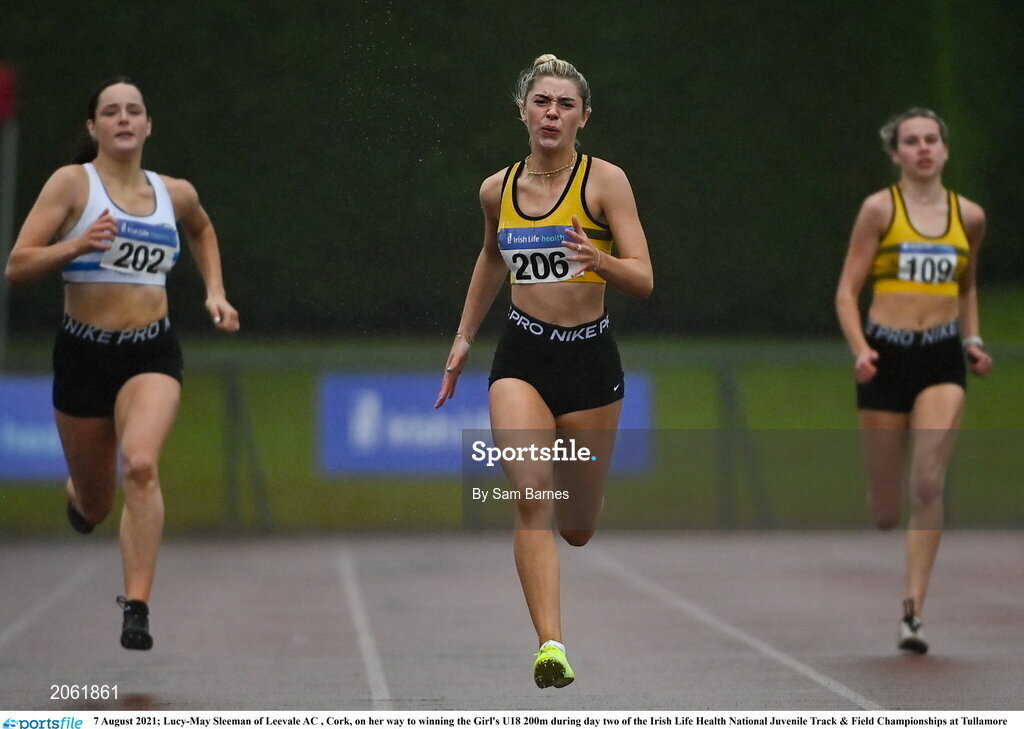 7 August 2021; Lucy-May Sleeman of Leevale AC , Cork, on her way to winning the Girl's U18 200m during day two of the Irish Life Health National Juvenile Track & Field Championships at Tullamore Harriers Stadium in Tullamore, Offaly. Photo by Sam Barnes/Sportsfile