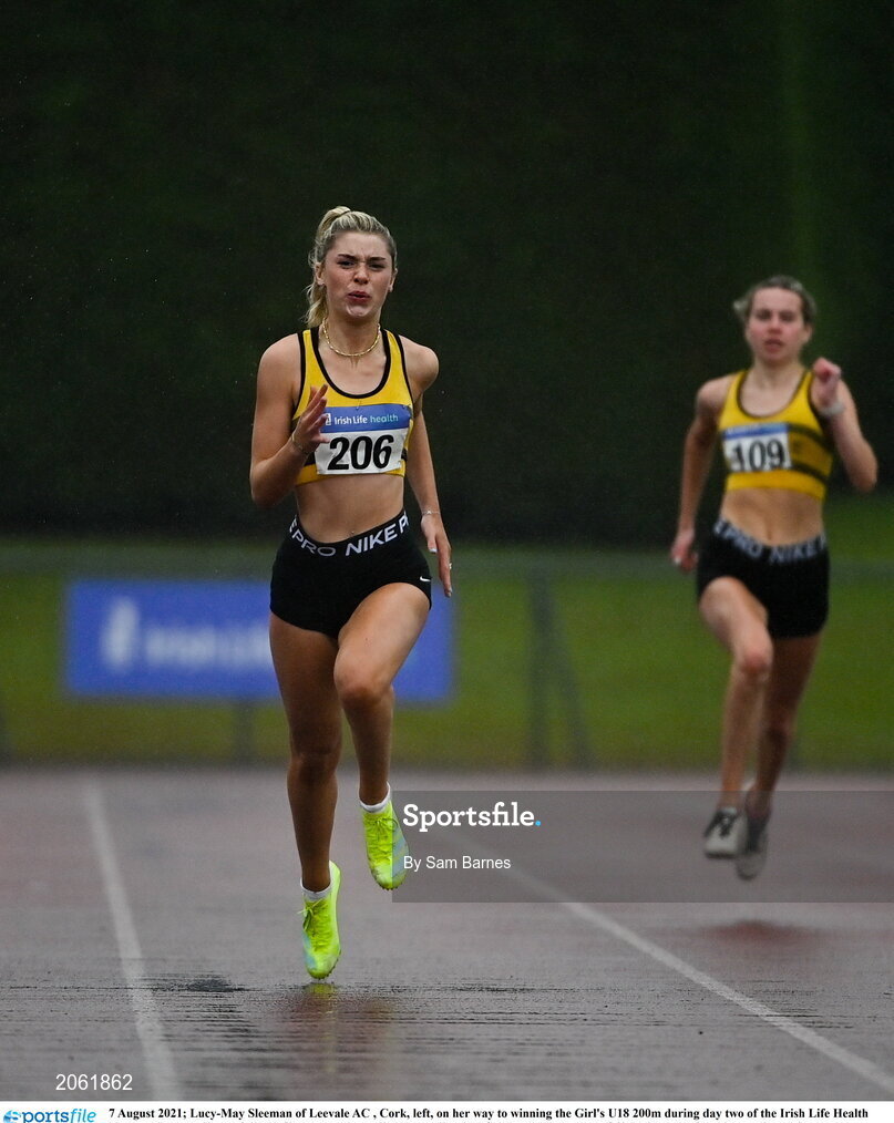 7 August 2021; Lucy-May Sleeman of Leevale AC , Cork, left, on her way to winning the Girl's U18 200m during day two of the Irish Life Health National Juvenile Track & Field Championships at Tullamore Harriers Stadium in Tullamore, Offaly. Photo by Sam Barnes/Sportsfile