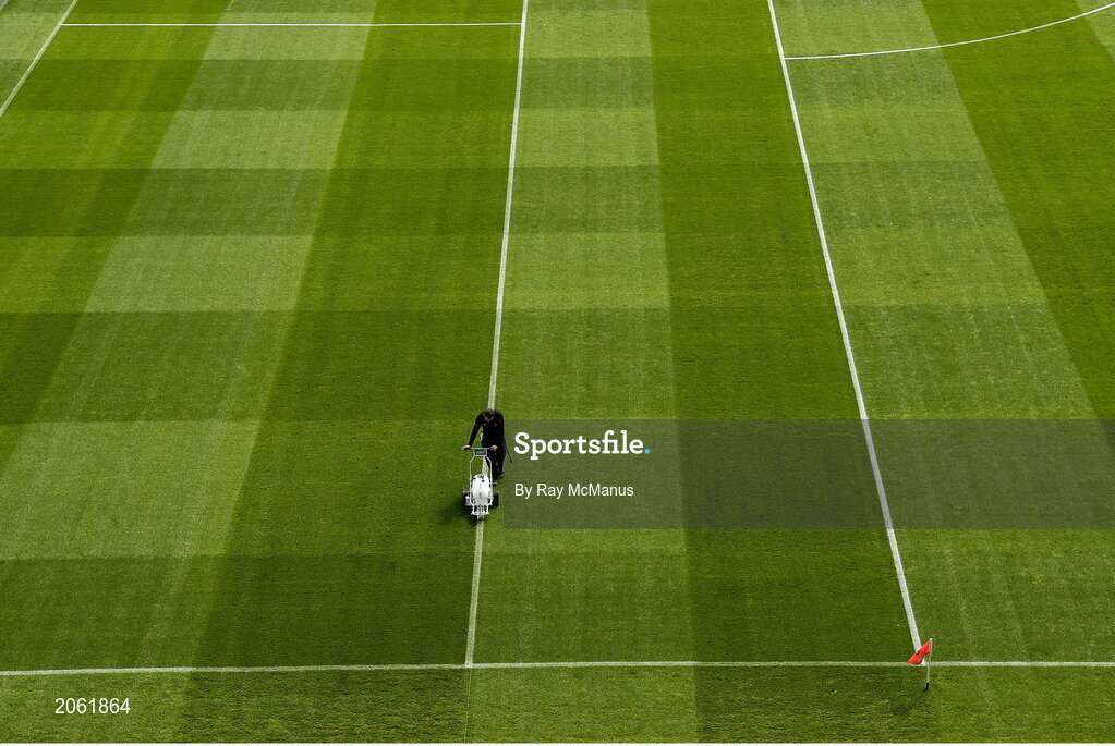 8 August 2021; Deputy head groundsman Colm Daly whitens the 14m line before the GAA Hurling All-Ireland Senior Championship semi-final match between Kilkenny and Cork at Croke Park in Dublin. Photo by Ray McManus/Sportsfile