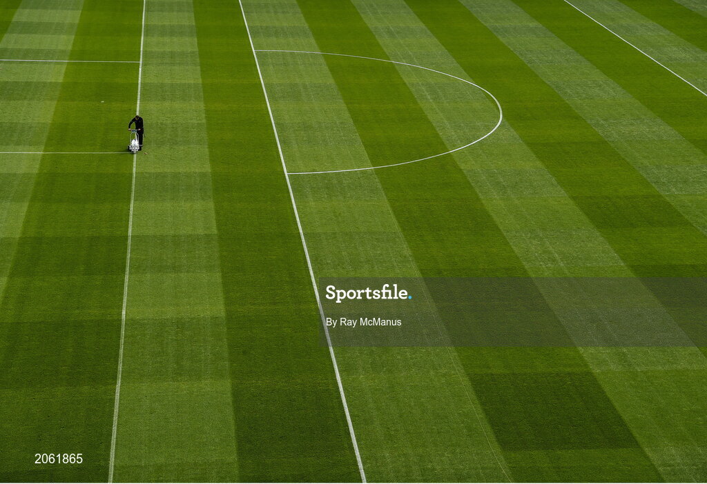 8 August 2021; Deputy head groundsman Colm Daly whitens the 14m line before the GAA Hurling All-Ireland Senior Championship semi-final match between Kilkenny and Cork at Croke Park in Dublin. Photo by Ray McManus/Sportsfile