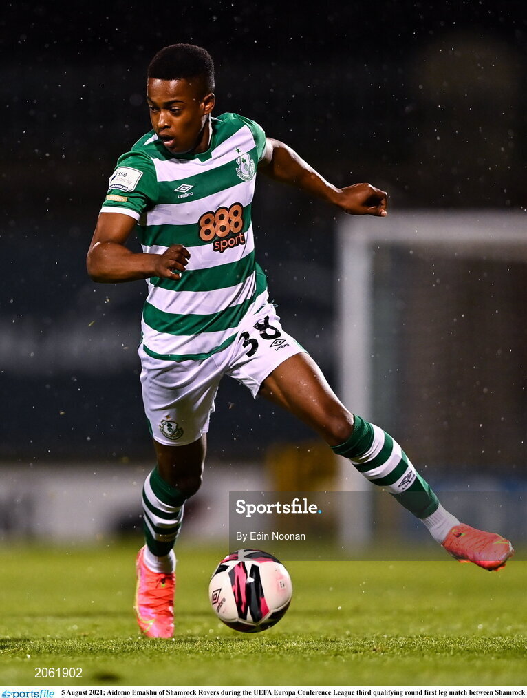5 August 2021; Aidomo Emakhu of Shamrock Rovers during the UEFA Europa Conference League third qualifying round first leg match between Shamrock Rovers and Teuta at Tallaght Stadium in Dublin. Photo by Eóin Noonan/Sportsfile