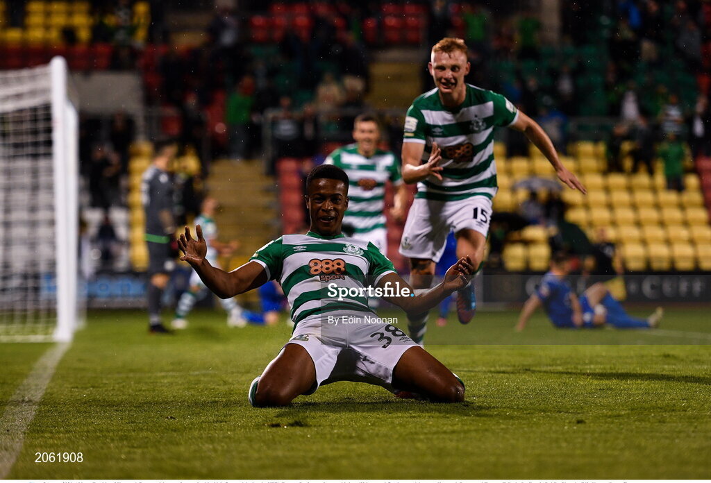 5 August 2021; Aidomo Emakhu of Shamrock Rovers celebrates after scoring his side's first goal during the UEFA Europa Conference League third qualifying round first leg match between Shamrock Rovers and Teuta at Tallaght Stadium in Dublin. Photo by Eóin Noonan/Sportsfile