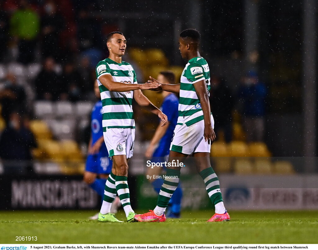 5 August 2021; Graham Burke, left, with Shamrock Rovers team-mate Aidomo Emakhu after the UEFA Europa Conference League third qualifying round first leg match between Shamrock Rovers and Teuta at Tallaght Stadium in Dublin. Photo by Eóin Noonan/Sportsfile