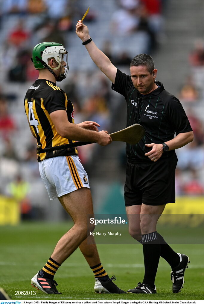 8 August 2021; Paddy Deegan of Kilkenny receives a yellow card from referee Fergal Horgan during the GAA Hurling All-Ireland Senior Championship semi-final match between Kilkenny and Cork at Croke Park in Dublin. Photo by Harry Murphy/Sportsfile