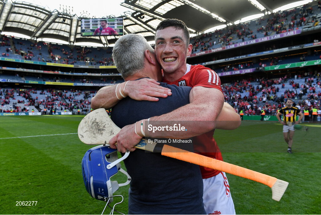 8 August 2021; Seán O'Donoghue of Cork celebrates with Cork selector Diarmuid O'Sullivan after their side's victory in the GAA Hurling All-Ireland Senior Championship semi-final match between Kilkenny and Cork at Croke Park in Dublin. Photo by Piaras Ó Mídheach/Sportsfile