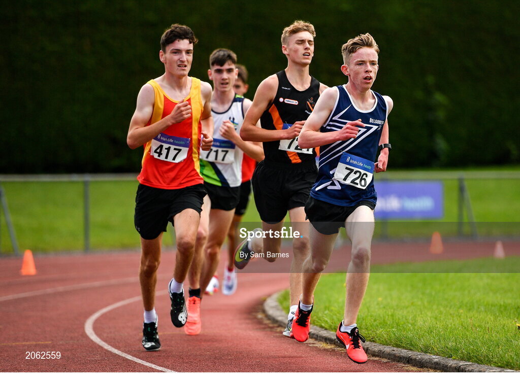 8 August 2021; Eoghan O'Connor of Belgooly AC, Cork, right, competing in the Boy's U16 3000m during day three of the Irish Life Health National Juvenile Track & Field Championships at Tullamore Harriers Stadium in Tullamore, Offaly. Photo by Sam Barnes/Sportsfile