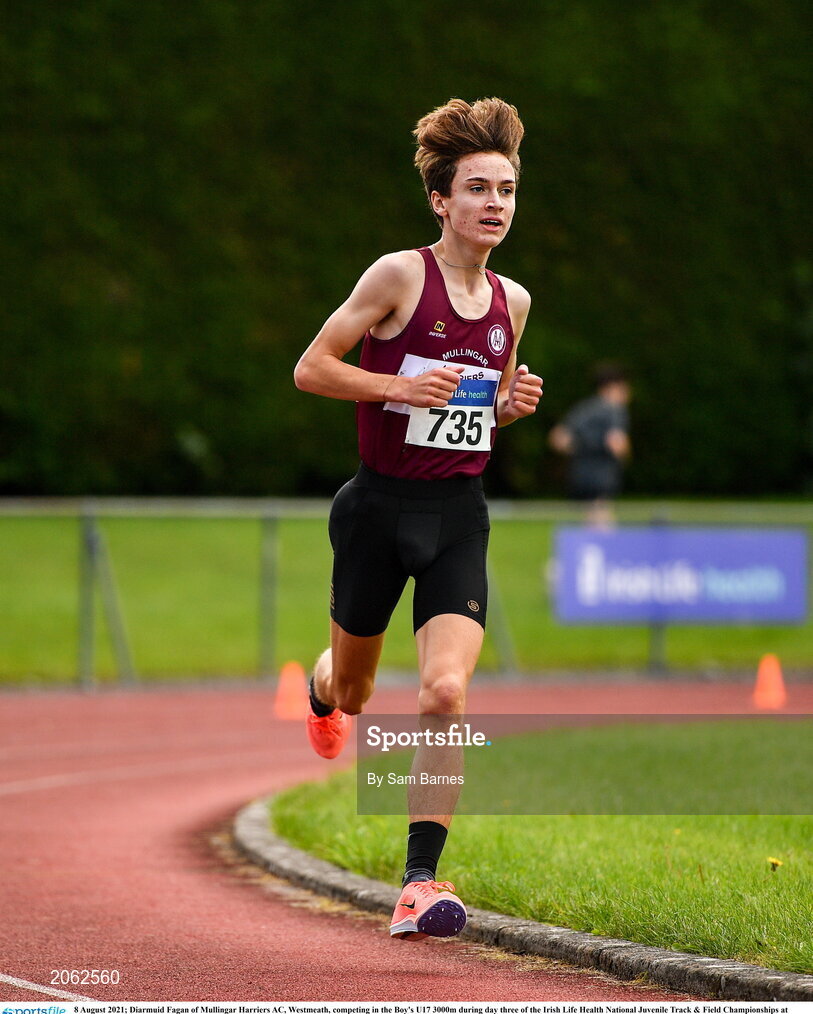 8 August 2021; Diarmuid Fagan of Mullingar Harriers AC, Westmeath, competing in the Boy's U17 3000m during day three of the Irish Life Health National Juvenile Track & Field Championships at Tullamore Harriers Stadium in Tullamore, Offaly. Photo by Sam Barnes/Sportsfile