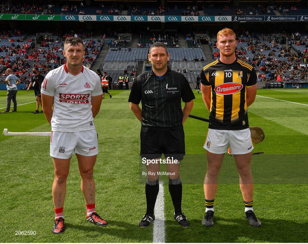 8 August 2021; Match referee Fergal Horgan with the two captains Patrick Horgan of Cork and Adrian Mullen of Kilkenny before the GAA Hurling All-Ireland Senior Championship semi-final match between Kilkenny and Cork at Croke Park in Dublin. Photo by Ray McManus/Sportsfile