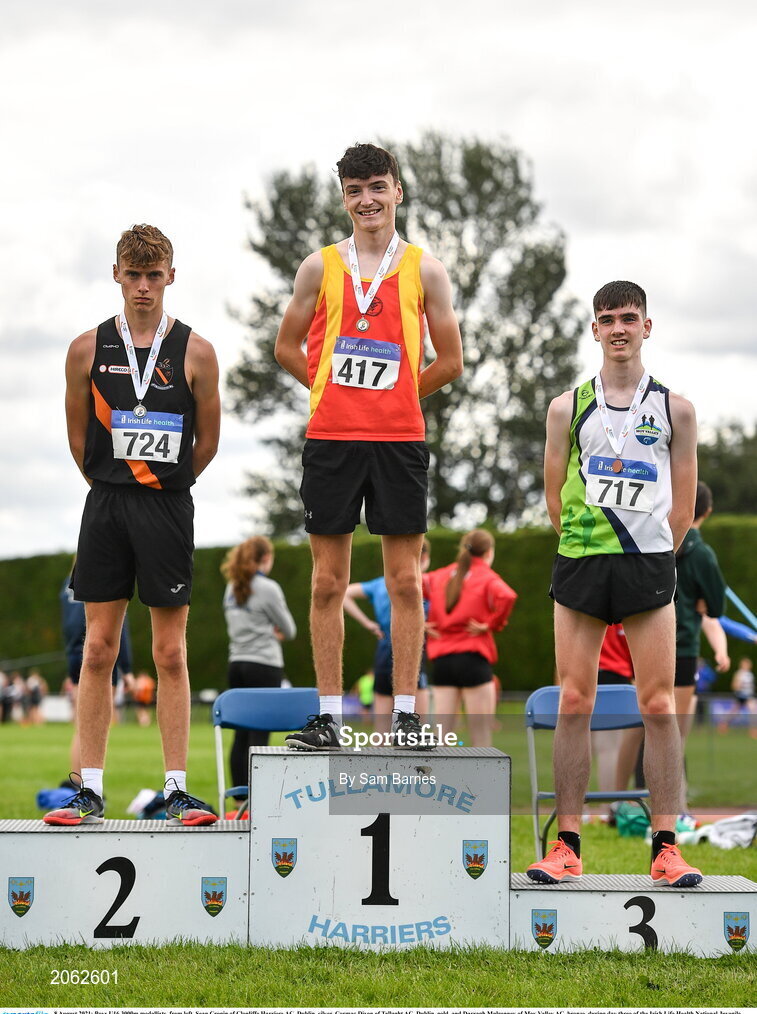 8 August 2021; Boys U16 3000m medallists, from left, Sean Cronin of Clonliffe Harriers AC, Dublin, silver, Cormac Dixon of Tallaght AC, Dublin, gold, and Darragh Mulronney of Moy Valley AC, bronze, during day three of the Irish Life Health National Juvenile Track & Field Championships at Tullamore Harriers Stadium in Tullamore, Offaly. Photo by Sam Barnes/Sportsfile