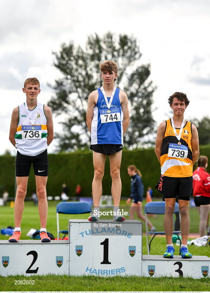 8 August 2021; Boys U18 3000m medallists, from left, Jack Fenlon of St Abbans AC, Laois, silver, Harry Colbert of Waterford AC, gold, and Jonas Stafford of Ashford AC, Wicklow, bronze, during day three of the Irish Life Health National Juvenile Track & Field Championships at Tullamore Harriers Stadium in Tullamore, Offaly. Photo by Sam Barnes/Sportsfile