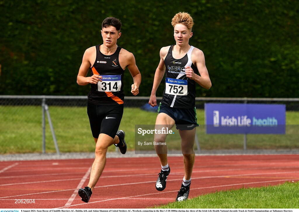 8 August 2021; Sean Boyne of Clonliffe Harriers AC, Dublin, left, and Aidan Shannon of United Striders AC, Wexford, competing in the Boy's U18 3000m during day three of the Irish Life Health National Juvenile Track & Field Championships at Tullamore Harriers Stadium in Tullamore, Offaly. Photo by Sam Barnes/Sportsfile
