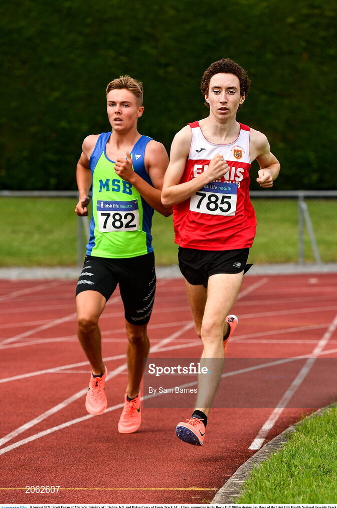 8 August 2021; Scott Fagan of Metro/St Brigid's AC, Dublin, left, and Dylan Casey of Ennis Track AC , Clare, competing in the Boy's U19 3000m during day three of the Irish Life Health National Juvenile Track & Field Championships at Tullamore Harriers Stadium in Tullamore, Offaly. Photo by Sam Barnes/Sportsfile
