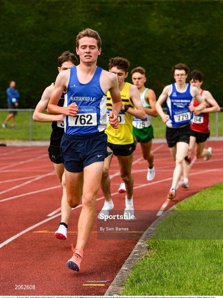 8 August 2021; Aidan Burke of Waterford AC, competing in the Boy's U18 3000m during day three of the Irish Life Health National Juvenile Track & Field Championships at Tullamore Harriers Stadium in Tullamore, Offaly. Photo by Sam Barnes/Sportsfile