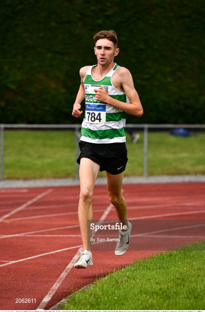 8 August 2021; Ciaran McNamee of Youghal AC, Cork, competing in the Boy's U19 3000m during day three of the Irish Life Health National Juvenile Track & Field Championships at Tullamore Harriers Stadium in Tullamore, Offaly. Photo by Sam Barnes/Sportsfile