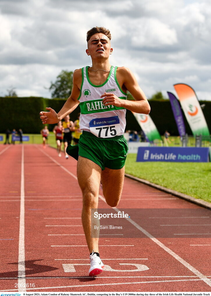 8 August 2021; Adam Condon of Raheny Shamrock AC, Dublin, competing in the Boy's U19 3000m during day three of the Irish Life Health National Juvenile Track & Field Championships at Tullamore Harriers Stadium in Tullamore, Offaly. Photo by Sam Barnes/Sportsfile
