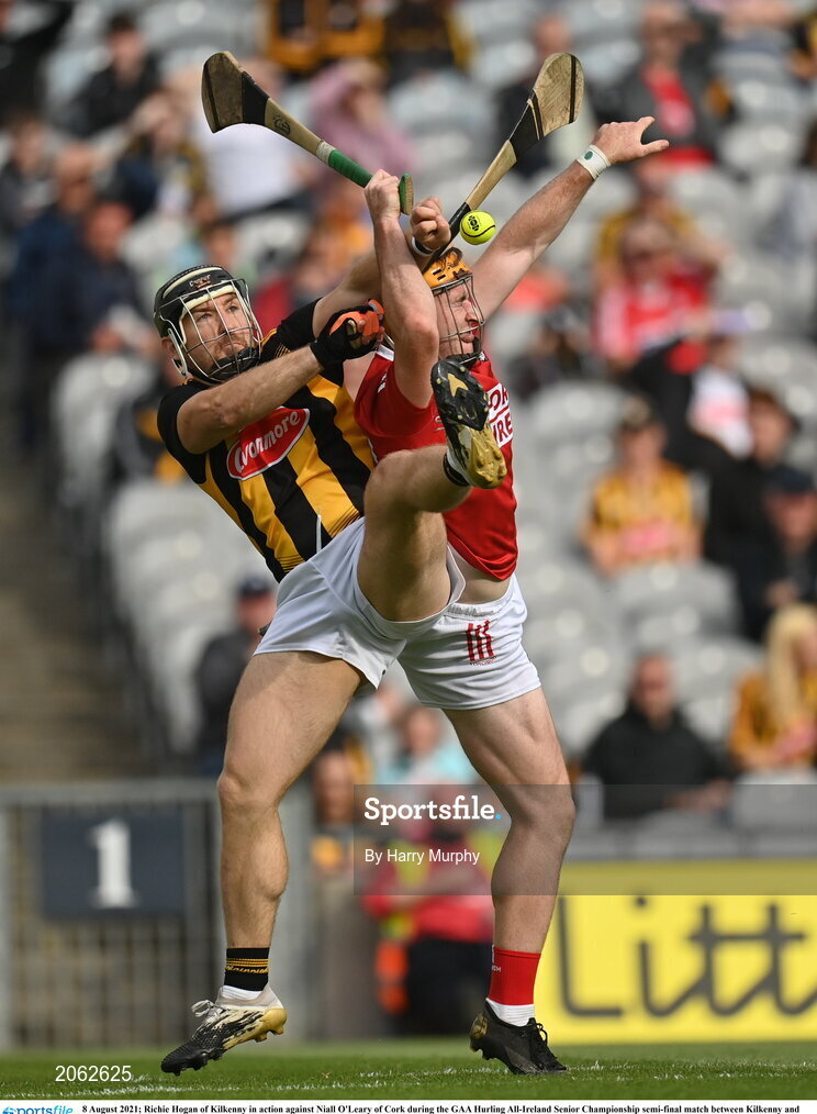 8 August 2021; Richie Hogan of Kilkenny in action against Niall O'Leary of Cork during the GAA Hurling All-Ireland Senior Championship semi-final match between Kilkenny and Cork at Croke Park in Dublin. Photo by Harry Murphy/Sportsfile