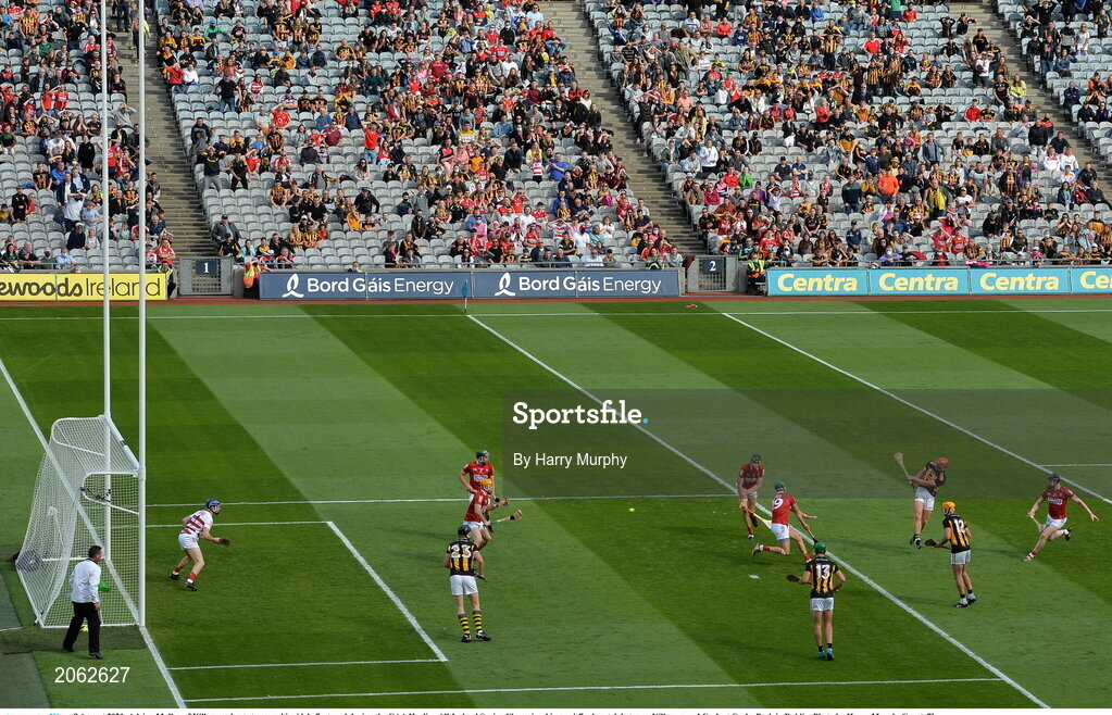 8 August 2021; Adrian Mullen of Kilkenny shoots to score his side's first goal during the GAA Hurling All-Ireland Senior Championship semi-final match between Kilkenny and Cork at Croke Park in Dublin. Photo by Harry Murphy/Sportsfile